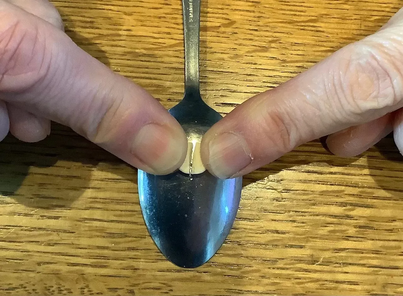 スプーンの凸側に、割線が長軸方向になるように載せます