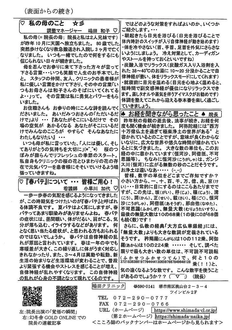 令和3年3月1日 こころ誌125号 | 内科は大阪府、堺市の医療法人祐希会 嶋田クリニック | 院内報「こころ」
