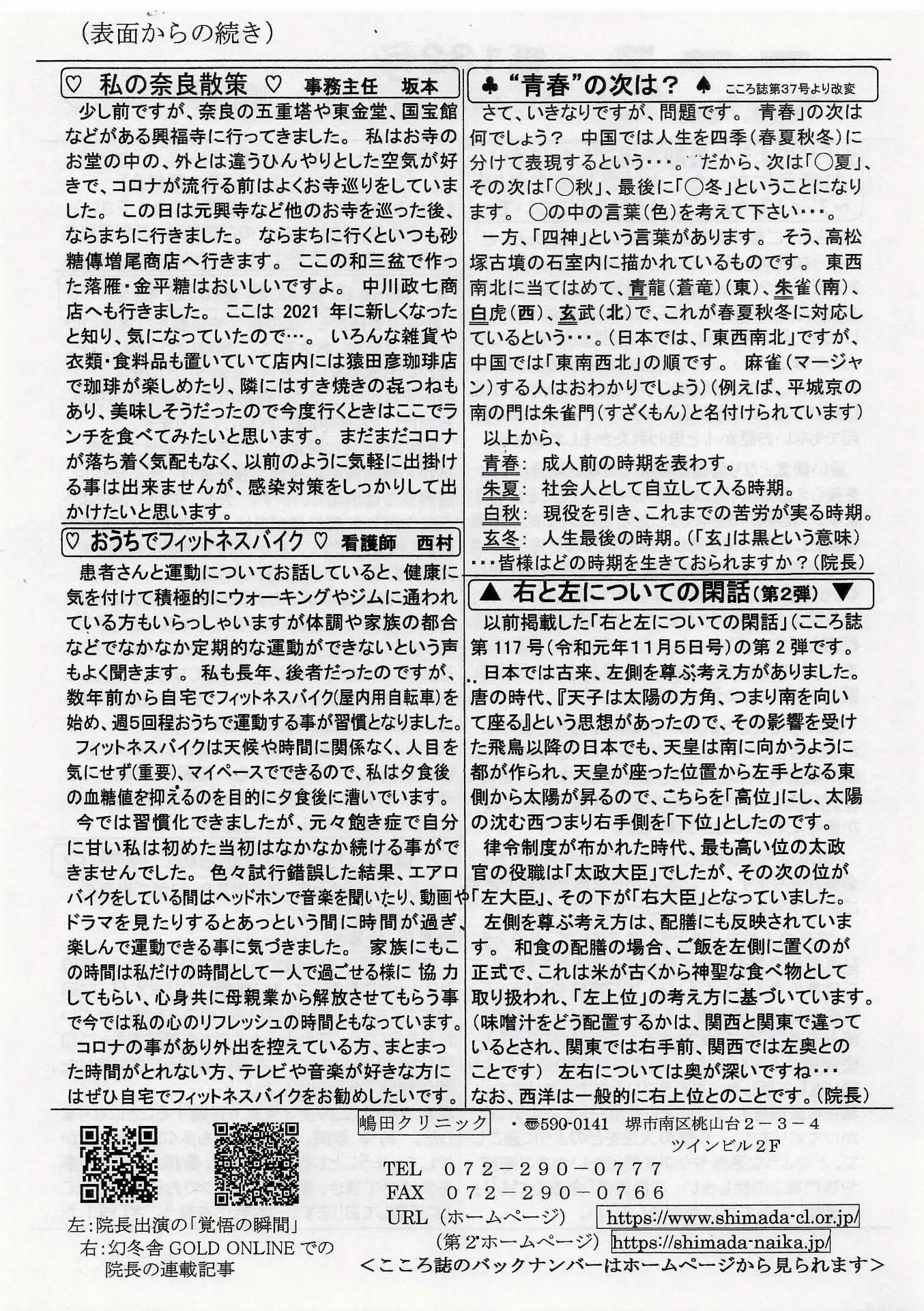 令和4年5月6日 こころ誌132号 | 内科は大阪府、堺市の医療法人祐希会 嶋田クリニック | 院内報「こころ」