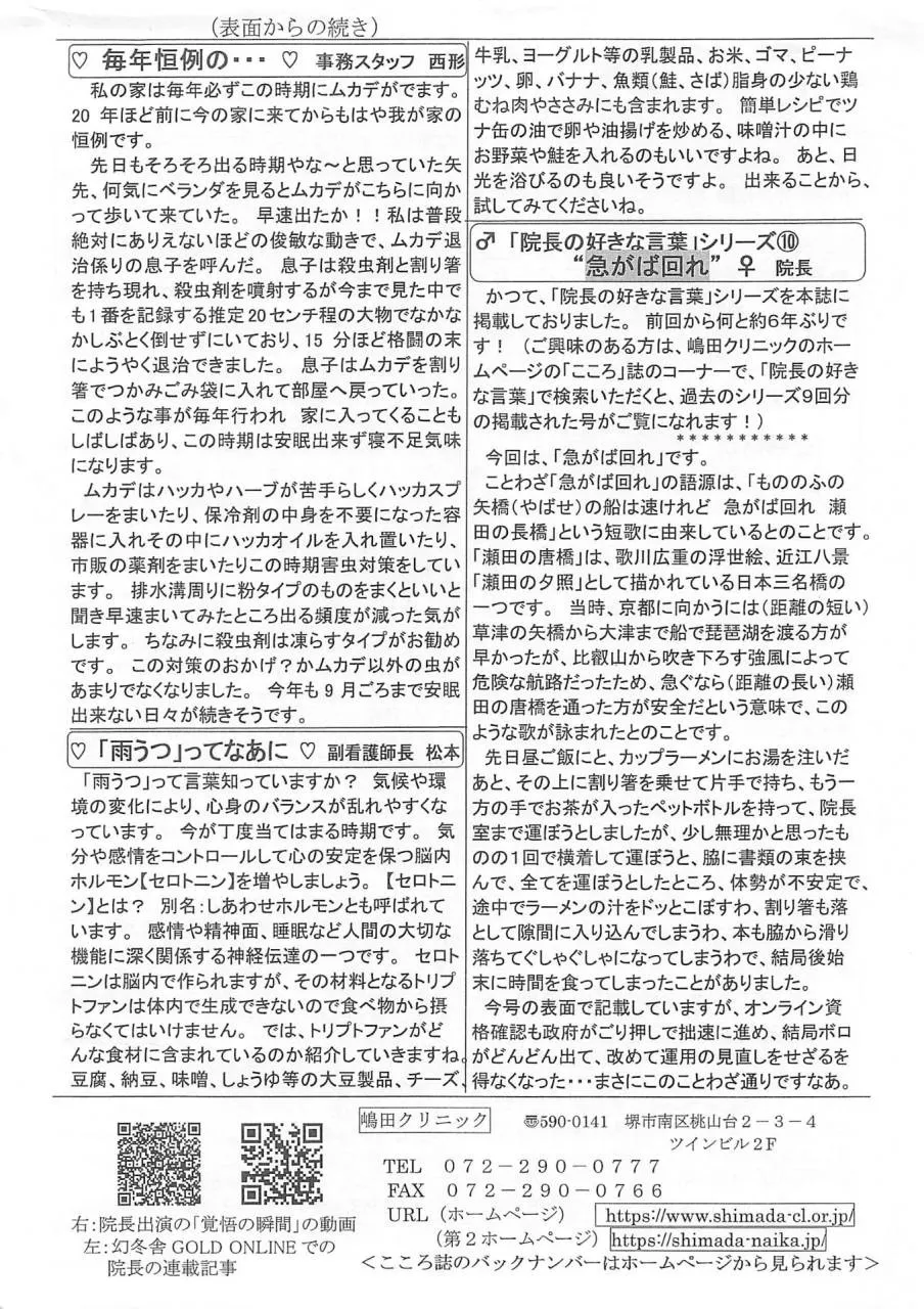 令和5年7月3日 こころ誌139号 | 内科は大阪府、堺市の医療法人祐希会 嶋田クリニック | 院内報「こころ」