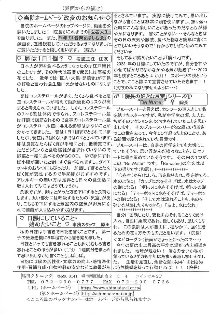 令和5年9月4日 こころ誌140号 | 内科は大阪府、堺市の医療法人祐希会 嶋田クリニック | 院内報「こころ」