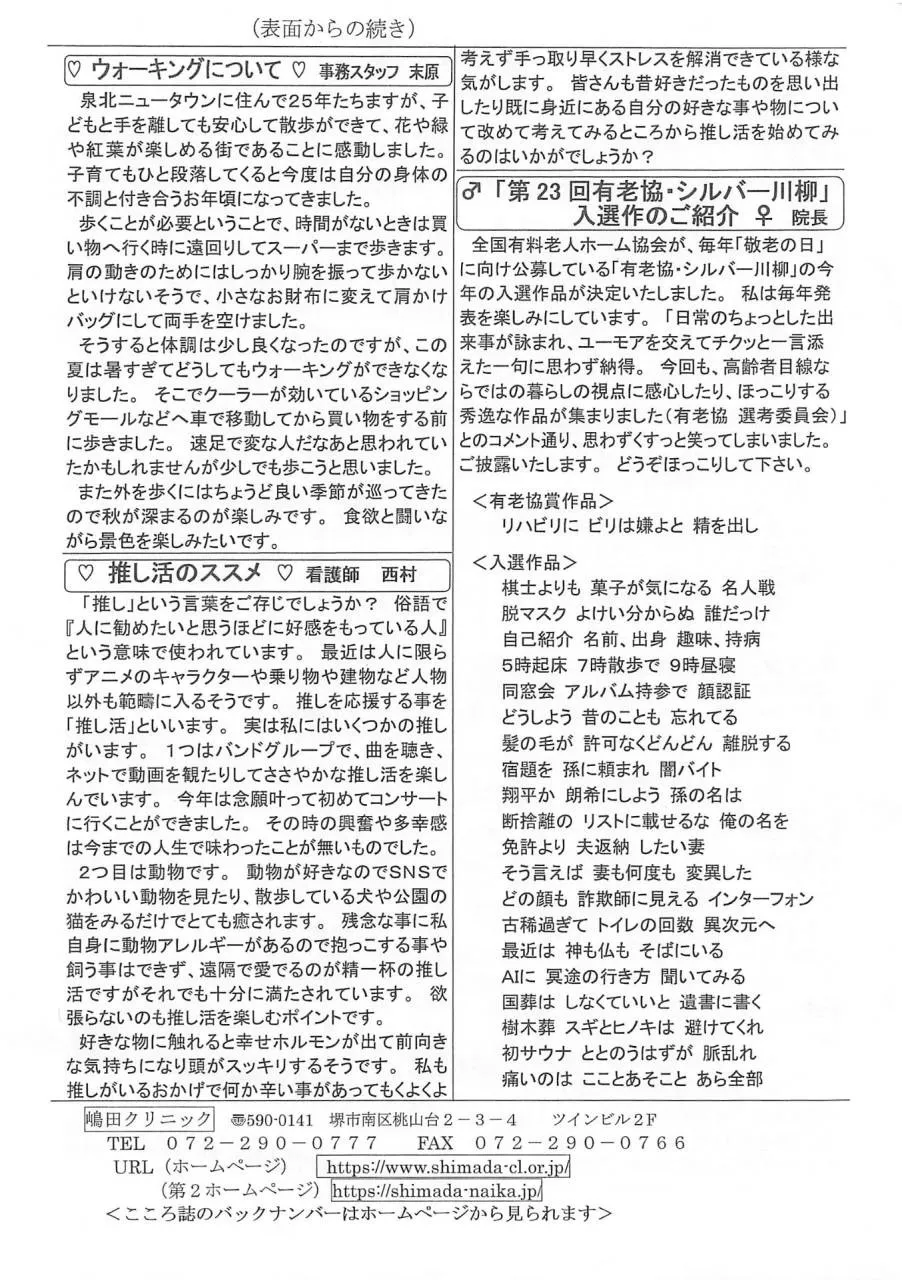 令和5年11月6日 こころ誌141号 | 内科は大阪府、堺市の医療法人祐希会 嶋田クリニック | 院内報「こころ」